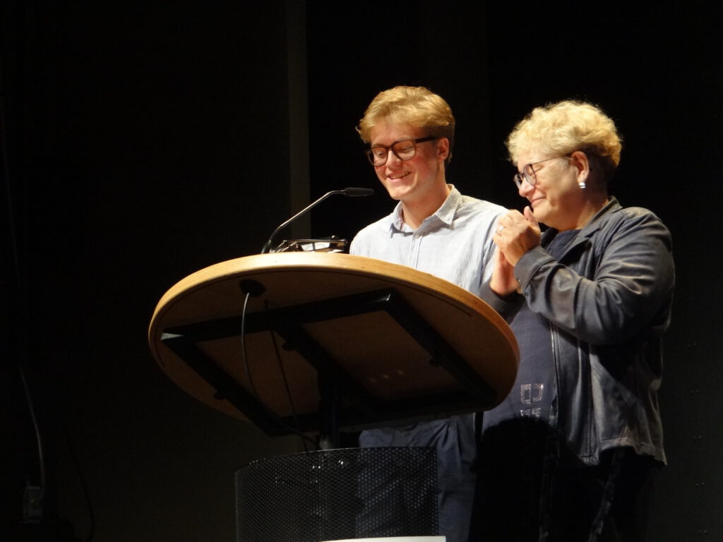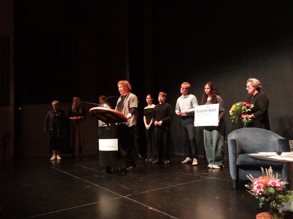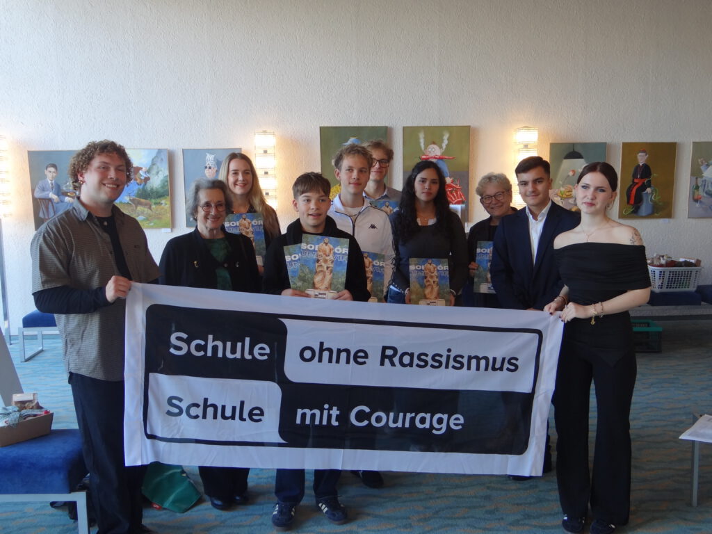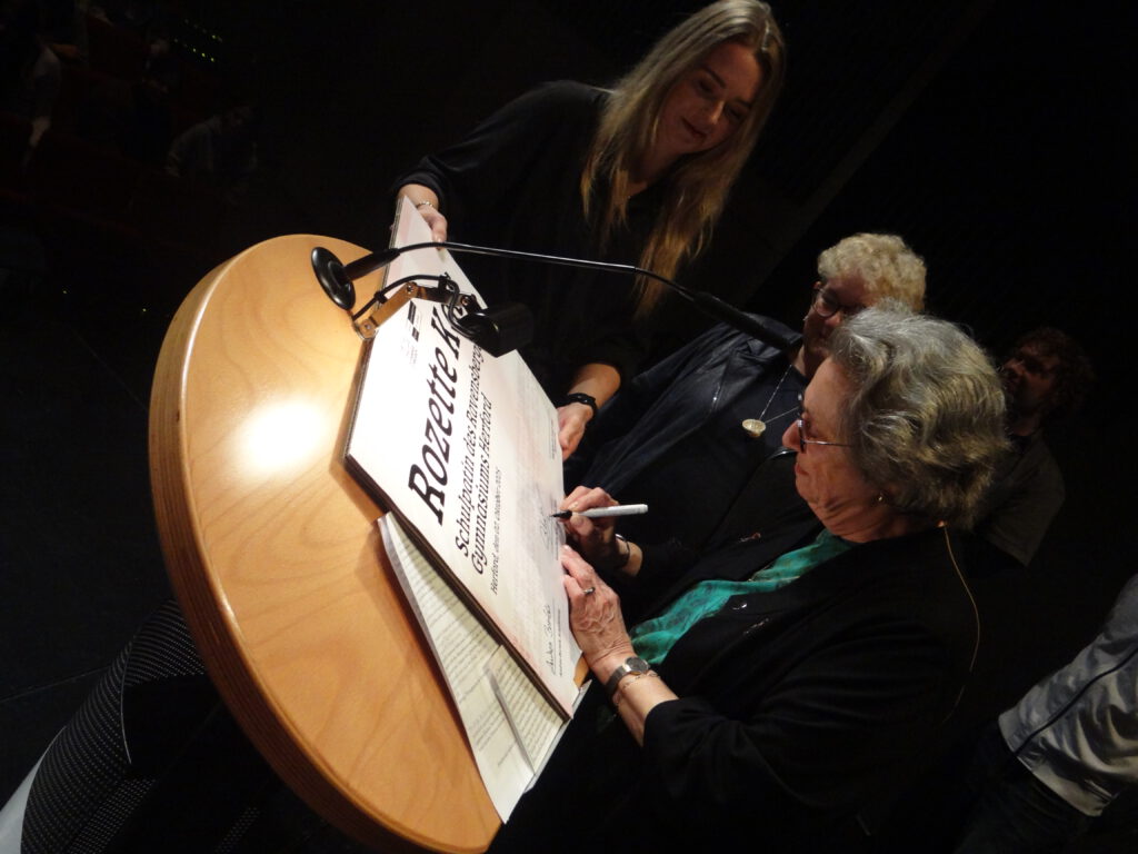 Raphaela Kula und Fritz Bornemeyer unterstützten die Organisation und Ausgestaltung der Veranstaltung. Als Atelier Ostbahnhof haben sie bereits verschiedene Gedenkveranstaltungen mit Rozette Kats durchgeführt. Zum Ende der Veranstaltung unterzeichneten die Schülerinnen und Schüler der SoR-AG, Rozette Kats und Andrea Bartels die Patenschaftsurkunde und besiegelten damit die Patenschaft der Holocaustüberlebenden für das „Schule-ohne-Rassismus“-Projekt am Ravensberger Gymnasium.