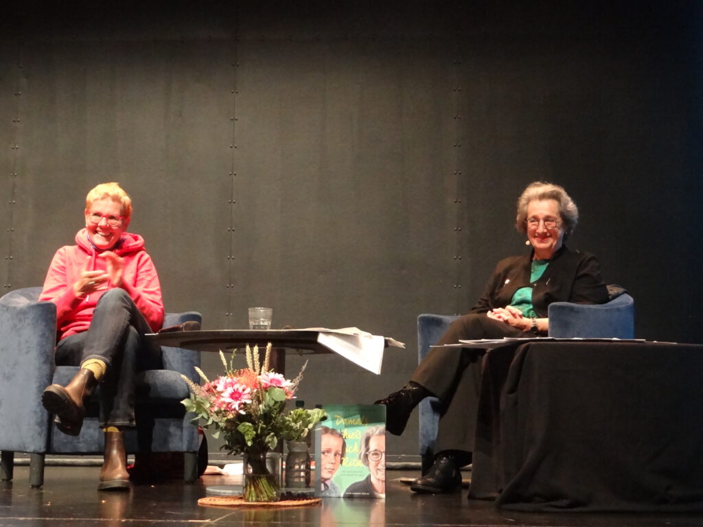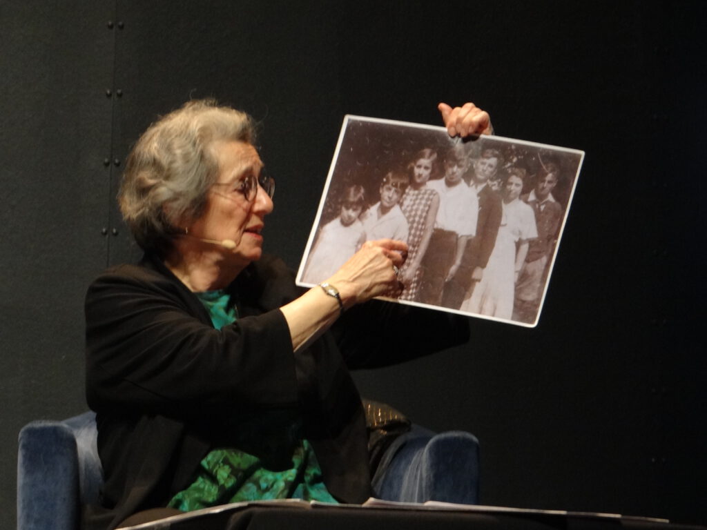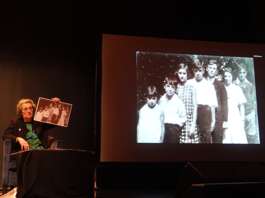 Die Holocaustüberlebende erzählte ihre Geschichte für die anwesenden Schülerinnen und Schüler der Jahrgangsstufen 10, EF und Q1. Auch waren Gäste der benachbarten Schulen, des Friedrichsgymnasiums, der Gesamtschule Friedenstal und des Elisabeth-von-der-Pfalz-Berufskollegs gekommen. Bereits als Baby wurde Rozette Kats von einer nichtjüdischen Familie aufgenommen. Nur so konnte sie die NS-Zeit überleben. Rozettes Angehörige, darunter ihre Eltern, wurden in den Konzentrationslagern Sobibór und Auschwitz ermordet. Mit sechs Jahren erfuhrt sie von ihrem Schicksal und davon, dass sie eigentlich einen anderen Namen hätte tragen sollen, denn Rozette wurde von ihren nichtjüdischen Eltern Rita genannt. Die Niederländerin erzählte von einzelnen Gegenständen, darunter Fotos und die Eheringe ihrer ermordeten Eltern, die sie bis heute bei sich trägt. Die Schülerinnen und Schüler konnten während des Zeitzeugengesprächs in die Frage nach Identität und Verlust eintauchen.